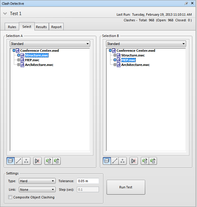 Na parte superior de cada painel, há uma lista suspensa que duplica o estado atual da janela Selection Tree. Você pode utilizar isso para selecionar itens para testes de interferência: