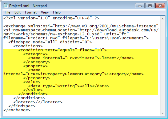 Abra o arquivo de mapa de propriedade aqui: C:\Program Files\Autodesk\Navisworks Manage 2015\Quantification\takeoff_maps\TakeoffPropertyMap.xml (ou utilize um modelo de mapa de arquivo de sua escolha). Cole o texto copiado para o arquivo de mapa de propriedade (encontre e substitua o nó de condição se ele estiver visível no arquivo).