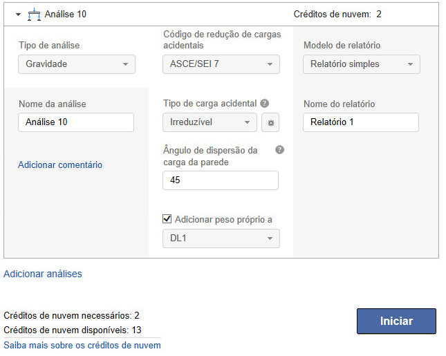 A página Nova análise é aberta, onde é possível definir os parâmetros da análise. Por padrão, ele exibe o tipo e os parâmetros da análise realizada anteriormente.