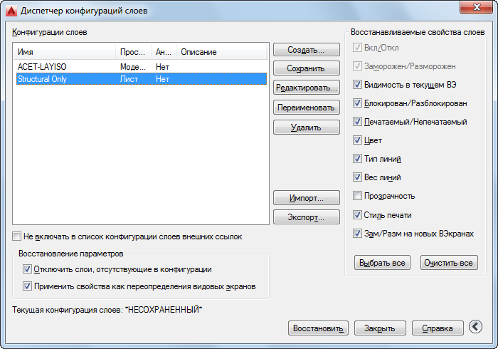 Можно сохранить настройки текущего слоя в чертеже в виде конфигурации, а затем восстанавливать эту конфигурацию. Сохранение конфигурации слоев удобно, когда есть необходимость в быстром возвращении к конкретным настройкам всех слоев в ходе различных этапов создания чертежа или для печати.