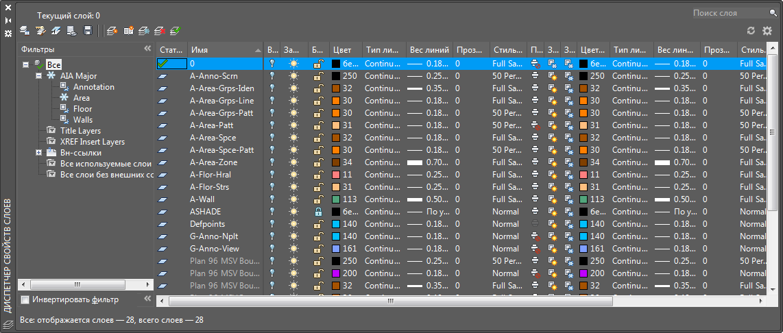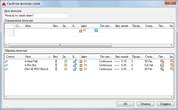 Для управления крупными наборами слоев можно создавать фильтры слоев. Диспетчер свойств слоев позволяет создать три типа фильтров слоев: фильтры групп, фильтры свойств и фильтры стандартов именования слоев. Фильтры свойств группируют слои на основании свойств и конфигураций слоев, например по видимости или цвету. Фильтры групп содержат слои, назначенные данной группе. Фильтры стандартов именования слоев содержат слои, связанные с указанной категорией стандартов.