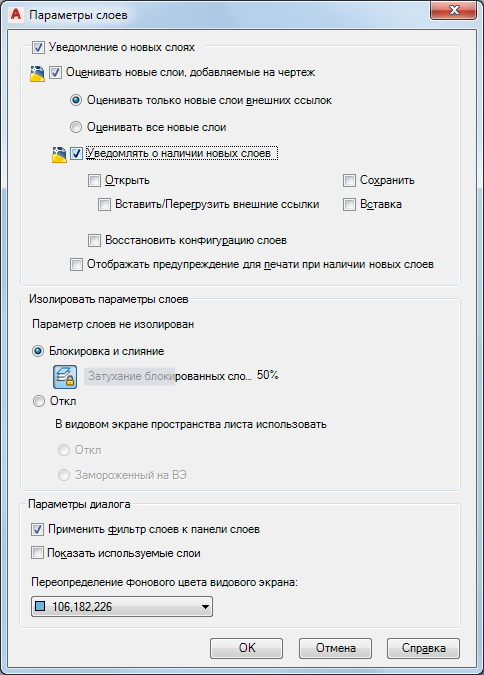 - Для настройки уведомления о новых слоях в чертеже установите флажок "Выявлять новые слои, добавляемые в чертеж".