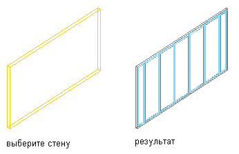 Данная процедура предназначена для того, чтобы создать витражи на основе уже имеющихся стандартных стен. Для каждого сегмента стены создается отдельная витраж. В процессе преобразования выводится подсказка о выборе стиля витража, определяющего количество и размер ячеек в сетке витража, а также наружный вид ячеек, каркаса и импостов.