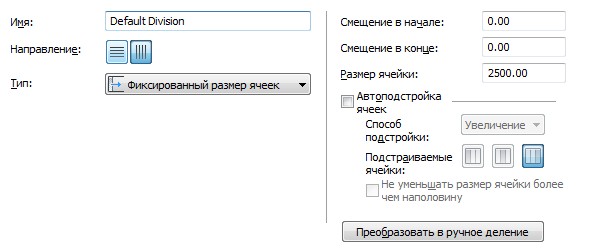 При задании вертикальной сетки под размером ячейки понимается длина ячейки между импостами. При задании горизонтальной сетки под размером ячейки понимается высота ячейки.
