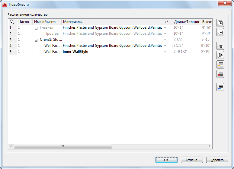 Колонны наоборот автоматически получают знак плюс, так как они добавляются к поверхности стены, а следовательно, увеличивают потребность в материале. Однако можно изменить расчетный знак вручную, указывая, как обрабатывать подобласти. То же самое относится к объектам, добавленным вручную или с помощью числовых значений.