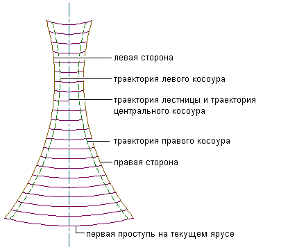 Линии для пользовательской лестницы создаются с помощью отрезков, легких полилиний или дуговых сегментов. Все линии проступи должны пересекать края лестницы. Графика, представляющая траектории несущих конструкций, должна быть непрерывной на протяжении всей траектории лестницы.