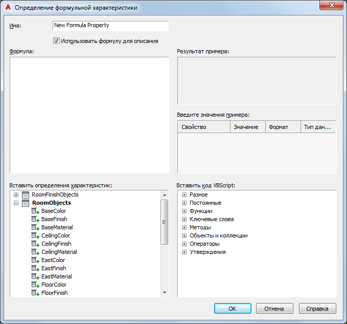 Имена определений характеристик, используемые в этой формуле, отображаются в квадратных скобках, например [Ширина]. Если определение характеристики принадлежит описанию другого набора характеристик, не содержащему данную формулу, то это имя также отображается, например [Объекты-двери:Высота].