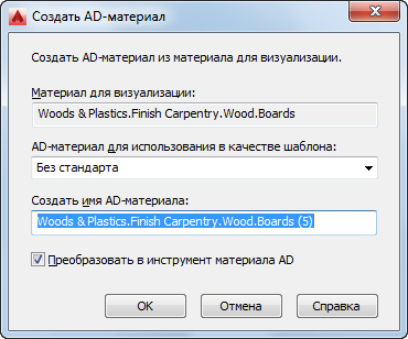 - Если материал визуализации непосредственно перетаскивался на чертеж, будет отображен рабочий лист "Создать AD-материал".