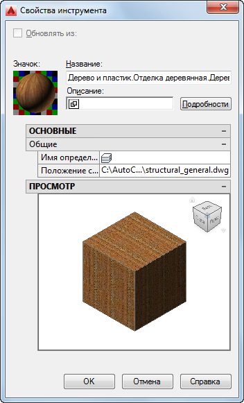 Теперь инструмент материала представлен на палитре значком куба AutoCAD Architecture с правильным отображением материала.