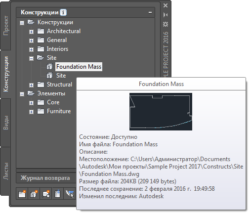 В Диспетчере структуры проекта предусмотрена возможность просмотра миниатюр чертежей проекта. Изображение для предварительного просмотра может представлять собой графический объект, выносной элемент или их комбинацию. Отображение образцов для просмотра удобно при перемещении между компонентами крупномасштабных проектов с большим количеством чертежей.