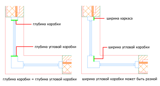 Для углового окна глубина коробки и глубина угловой коробки равны. Ширина коробки и ширина угловой коробки могут быть разными. Ширина угловой коробки определяется по короткой стороне.