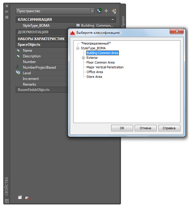 Если границы сформированного пространства рассчитываются на основе стандартов, в некоторых случаях пространство приходится классифицировать по выбранному стандарту, чтобы предоставить всю информацию, необходимую для расчета границ. Например, по стандарту BOMA пространства должны быть классифицированы в соответствии с типами, принятыми в стандарте, поскольку тип пространства важен для определения смещения границ.