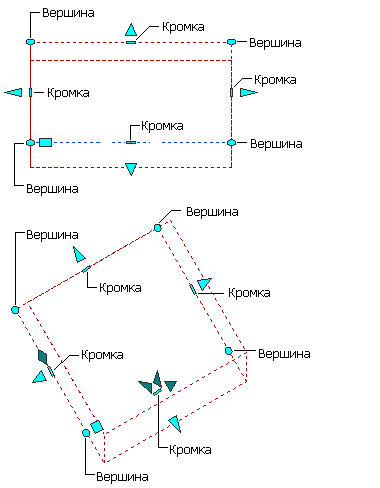 Доступные типы ручек редактирования выделенного перекрытия или ската крыши зависят от направления взгляда. Как показано на следующем рисунке, ручки кромки, свеса кромки, вершины и опорной точки отображаются как на видах сверху, так и на 3D изометрических видах. Ручки угла, смещения по вертикали, смещения по горизонтали и толщины доступны только на 3D изометрических видах.