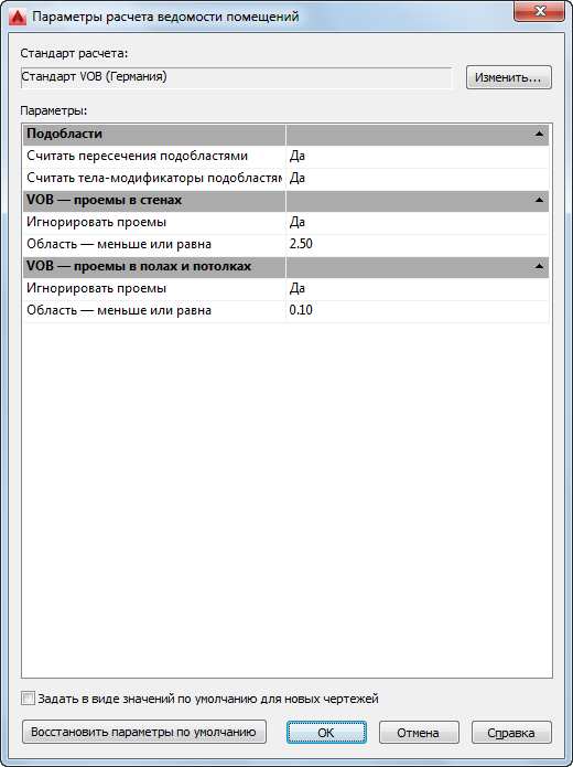 По умолчанию параметр активирован со значением 0,10 м². В этом случае проемы в полах и потолках меньше этого размера игнорируются. Все проемы больше этого значения рассчитываются.