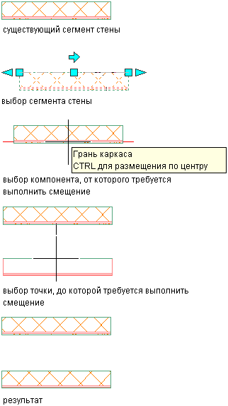 выполнить смещение стены по отношению к грани компонента стены, перемещайте курсор по стене, пока требуемая грань компонента не высветится в виде красной линии, и щелкните один раз.