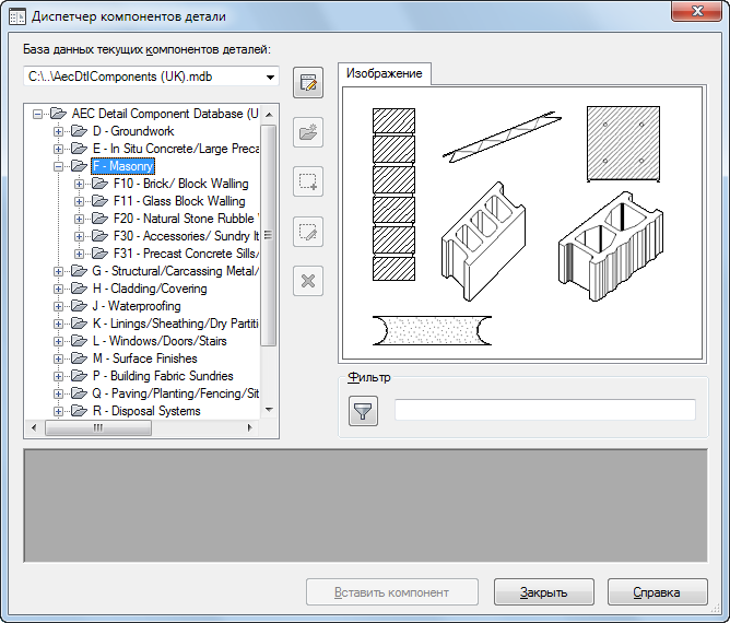 Через диалоговое окно Диспетчера компонентов деталей можно перемещаться по различным базам данных компонентов деталей. Поиск отдельных компонентов в базе данных можно упростить, если пользоваться функциями просмотра и фильтрации иерархического дерева. Как только требуемый компонент найден, можно вставить его в чертеж или перетащить на палитру инструментов для многократного использования. Отметим, что пять кнопок, расположенных вертикально в середине диалогового окна, неактивны, если у вас нет полномочий на редактирование выбранной базы данных.