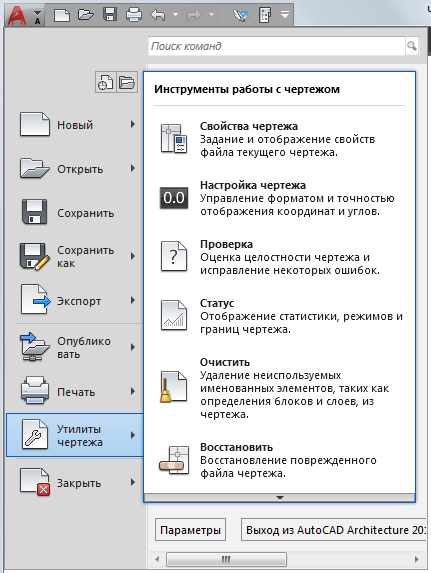 В меню приложения содержатся команды, относящиеся к созданию чертежей в целом.