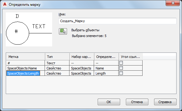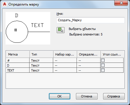 Эта процедура служит для создания марки спецификации, которая захватывает и отображает данные набора характеристик для определенного объекта на чертеже.
