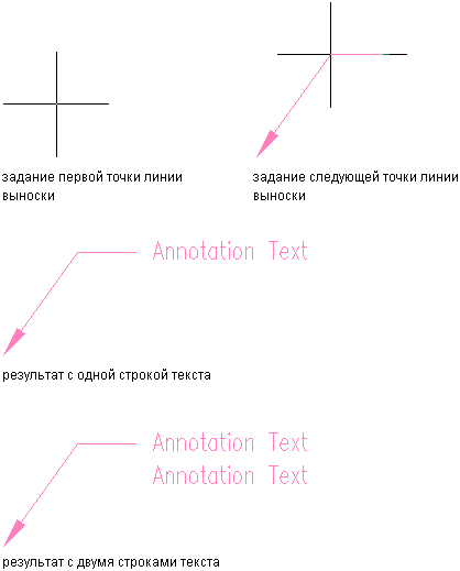 Данная процедура используется для добавления к чертежу многострочного текстового объекта с одиночной выноской, указывающей на любую точку, задаваемую пользователем в области рисования. Выноски строятся таким же способом, как полилинии: достаточно указать две точки для вставки прямолинейного отрезка линии. В качестве альтернативы (в зависимости от настройки свойства "Предельное количество точек") можно указать дополнительные точки, если выноска вставляется под углом и состоит из двух и более отрезков.