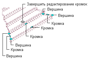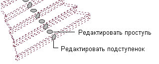 Для редактирования грани проступи можно выбрать ручки кромки или вершины. При редактировании грани проступи пользовательской лестницы отображаются следующие ручки: