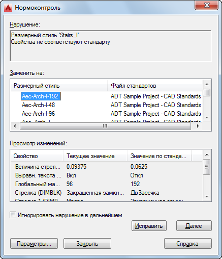 В "Неполадках" представлен первый размерный стиль AutoCAD, текстовый стили или стиль типа линий, несогласованный со стандартами AutoCAD проекта.