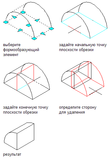 Эта процедура используется для обрезки формообразующего элемента. Задаваемая пользователем плоскость деления служит линией обрезки. Кроме того, следует определить, какую часть обрезаемого элемента следует удалить.