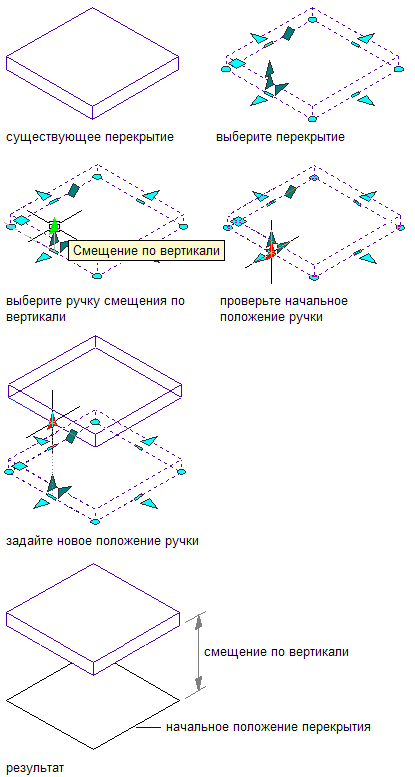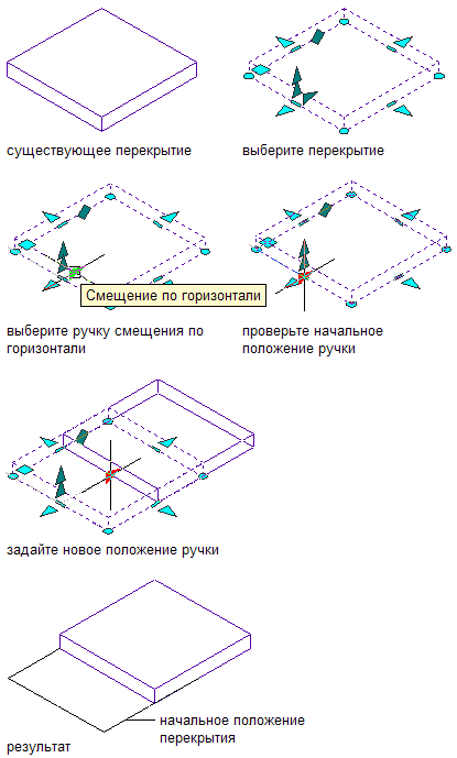 Эта процедура используется для изменения смещения по вертикали и горизонтали перекрытия или ската крыши в 3D изометрическом виде.