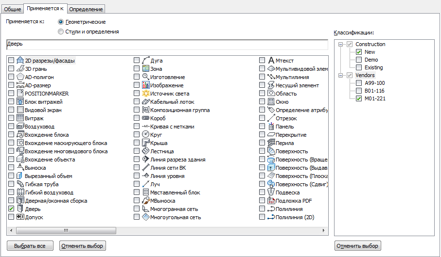 Характеристики, введенные вручную, которые совпадают для всех экземпляров стиля, находятся в определении набора характеристик на основе стиля и применяются к стилю (например стилю стены) или определению (например определению многовидового блока).