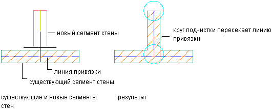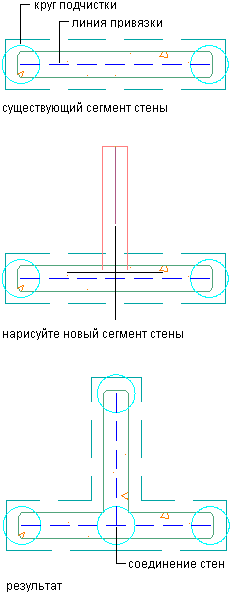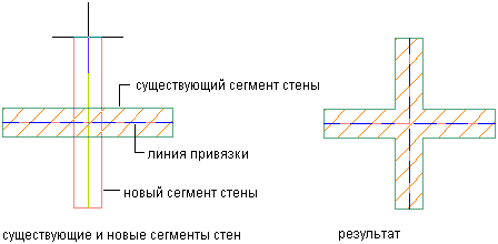 Если стены пересекаются между собой и правильно подчищены, в месте пересечения линий привязки стен создается новый стык. Точное местоположение стыка стен зависит от местоположения конечной точки нового сегмента стены. Во многих случаях стык стен не совпадает по расположению с осевой линией существующего сегмента стены. Местоположение стыка стен определяется по средневзвешенному расстоянию между конечными точками сегментов стены и толщины сегментов стен.