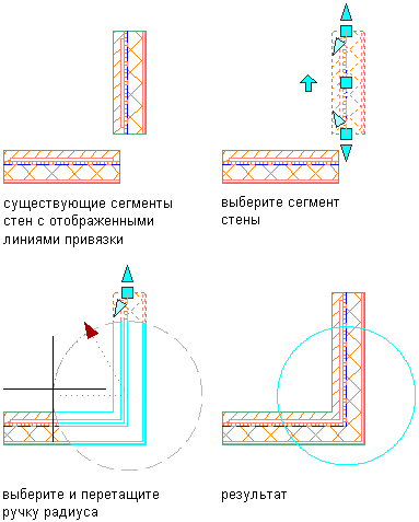 Совет: Лучшим способом правильной подчистки пересечения стен является обеспечение пересечения линий привязки отдельного сегмента стены и задание нулевого (0) радиуса для кругов подчистки этого сегмента стены.