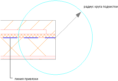 Круг подчистки располагается в начальной и конечной точке каждого сегмента стены. Центральная точка каждого круга подчистки является начальной или конечной точкой линии привязки стены.