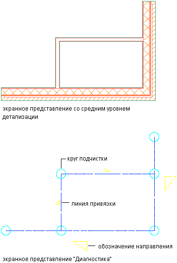 В диагностическом экранном представлении отображается линия привязки сегмента стены, радиус круга подчистки и обозначение направления, что позволяет упростить поиск и исправление ошибок. Чтобы изменить конфигурацию отображения, щелкните в строке состояния и выберите "Диагностика".