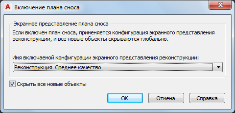 Путем перехода от одного типа плана реконструкции к другому можно работать на различных "видах" чертежа и избежать ошибок, часто связанных с редактированием нескольких чертежей. Параметры отображения для определенного типа плана сноса представлены в диалоговом окне "Параметры реконструкции". По умолчанию снесенным объектам назначается желтый цвет.