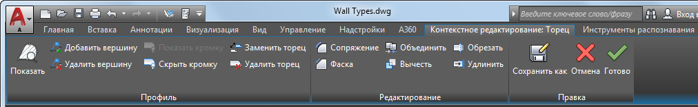 Редактирование по месту представляет собой особый режим редактирования, при котором компоненты объекта на основе полилиний или профилей могут редактироваться прямо на экране при ограничении других возможностей редактирования на чертеже. Например, в режиме редактирования по месту можно изменить торец стены, но нельзя сохранить и закрыть чертеж. После выхода из режима контекстного редактирования предоставляется выбор: отказаться от изменений, заменить существующее определение компонента или сохранить изменения в качестве нового определения.