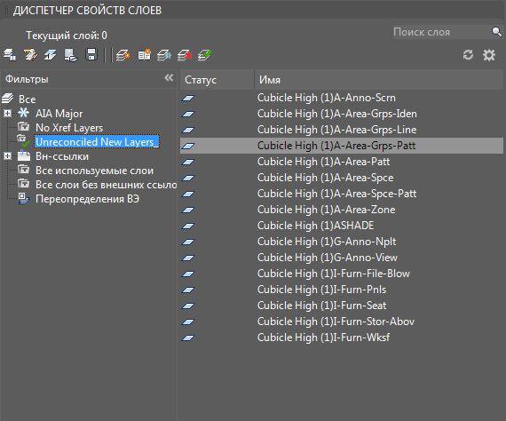 При нажатии ссылки открывается Диспетчер свойств слоев и автоматически выбирается фильтр "Несогласованные новые слои". В списке представлены все новые слои, добавленные к чертежу или файлам внешних ссылок.
