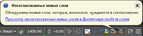 Если уведомление включено, при выполнении одного из заданных действий в строке состояния отображается марка "Уведомление о новых слоях" и выполняется поиск новых слоев. Можно просмотреть новые слои, щелкнув на ссылке "Несогласованные новые слои".