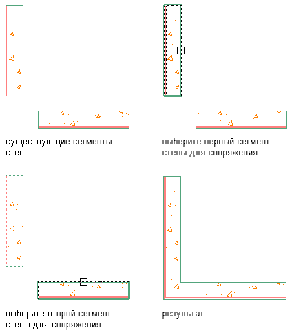 На иллюстрации ниже показано сопряжение двух сегментов стены с применением нулевого радиуса.