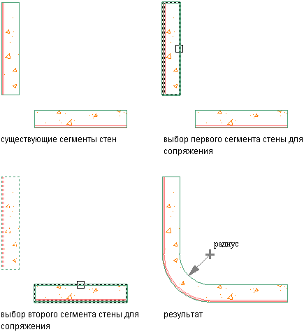Данная процедура используется для сопряжения двух стен друг с другом. При сопряжении стен создается дуговой сегмент стены с заданным радиусом, расположенный по касательной к базовым линиям выбранных стен.