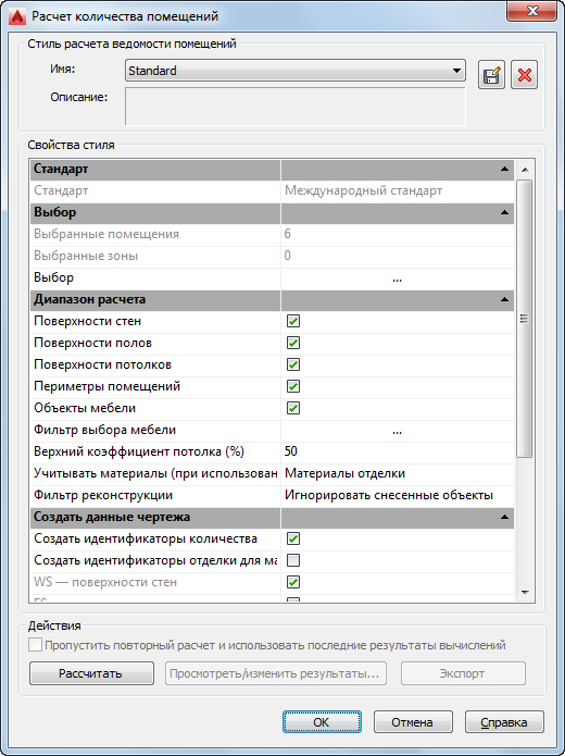 Для расчета количественных характеристик помещений необходимо указать диапазон расчета на основе текущего стандарта вычислений. В чертеже можно сохранить несколько разных стилей расчета с разными параметрами. Убедитесь, что в параметрах расчета задан правильный стандарт вычислений.