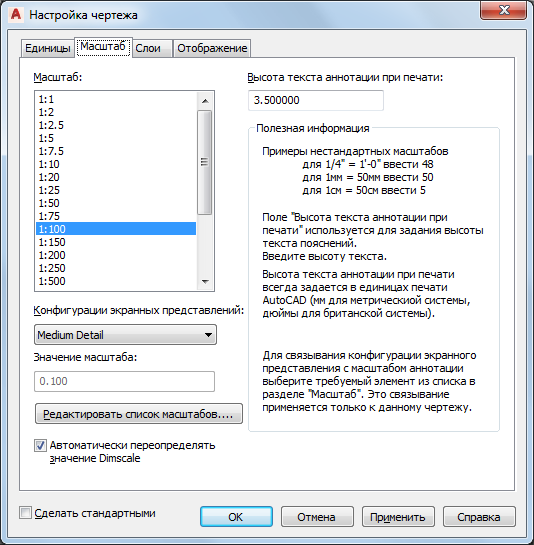 Если флажок "Автоматически переопределять значение Dimscale" снят, программа не будет автоматически переопределять в чертеже текущий стиль масштаба размеров.