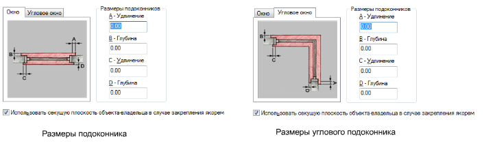 - Если требуется использовать для закрепленных якорями окон вместо секущей плоскости окна секущую плоскость стены, установите флажок "Использовать секущую плоскость объекта-владельца в случае закрепления якорем".