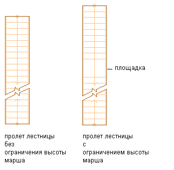 Эти параметры используются для автоматического создания площадок в лестничном марше. Например, если лестничный марш содержит 18 ступеней, а пользователь установил значение 15 для максимального количества ступеней, тогда лестница будет иметь два марша и одну площадку посередине, при этом с каждой стороны площадки будет меньше 15 подступенков.
