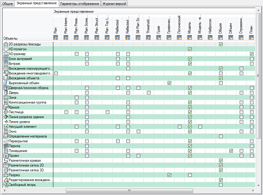 В правой панели содержится матрица, в которой перечислены все объекты и их экранное представление. Флажок под экранным представлением показывает, что набор ЭП использует данное представление для отображения соответствующего объекта. Например, в наборе "ЭП модель" большинство объектов используют "Экранное представление модель".