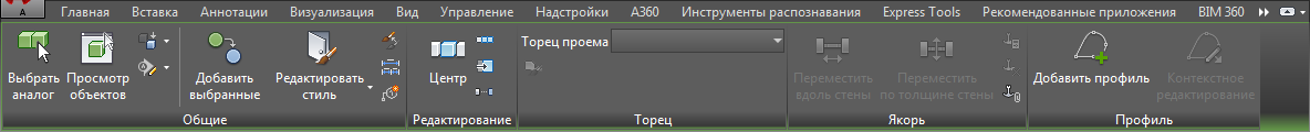 - Контекстные вкладки отображаются в зависимости от объекта, выбранного в области чертежа. Если выбрана дверь, отображается контекстная вкладка для двери. Команды на контекстных вкладках соответствуют командам контекстного меню объекта.