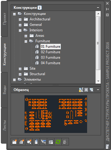 2. В Диспетчере структуры проекта откройте вкладку "Конструкции", "Виды" или "Листы".