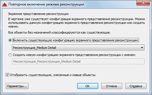 При повторном включении режима реконструкции на чертеже, который уже был активирован, можно продолжать работу с существующей конфигурацией экранного представления для реконструкции или создать новую.