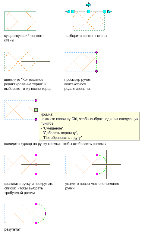 Данная процедура применяется для преобразования кромки компонента стены в дугу при помощи ручек кромки.
