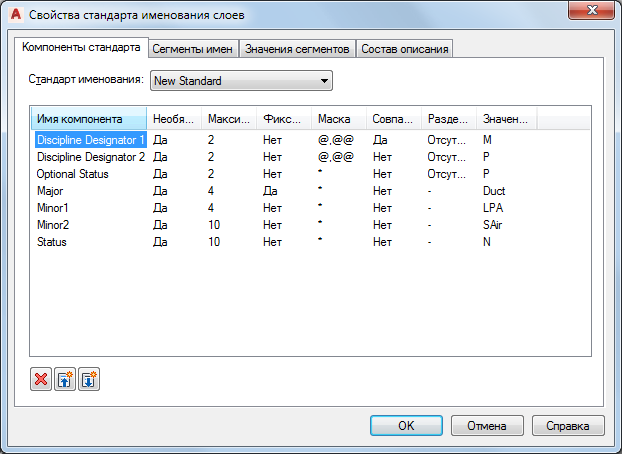 Каждый стандарт именования слоев определяет некоторое количество полей компонентов, которые составляют имя слоя, и определяет правила для содержимого, разрешенного в каждом поле. Если создается или редактируете стандарт именования слоев, осуществляется доступ к свойствам стандарта именования слоев для редактирования полей компонентов.