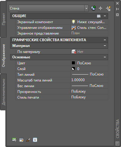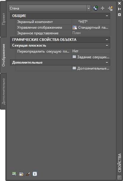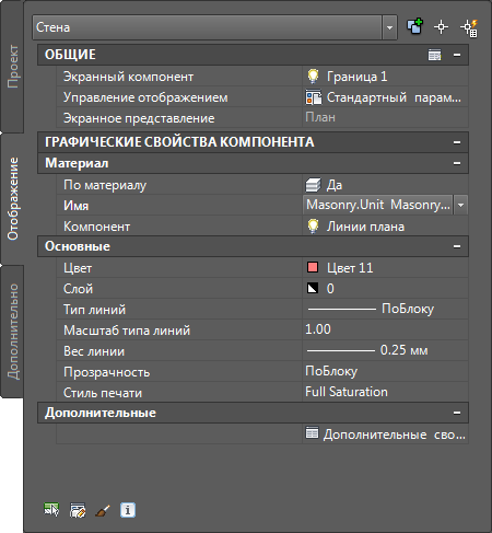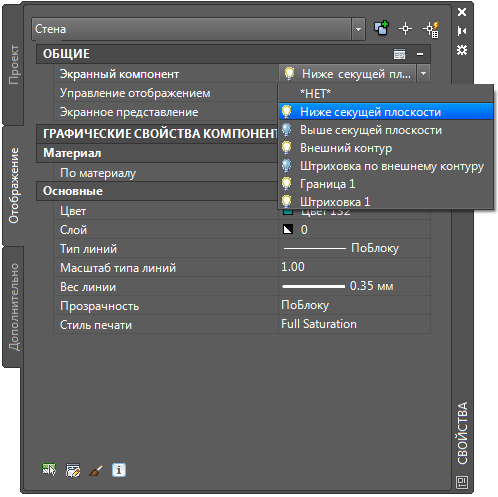 Вкладку "Отображение" палитры свойств можно использовать для изменения настроек графических свойств выбранного объекта в текущем экранном представлении. Можно изменить настройки свойств, применяемых к объекту в целом (например, "Высота секущей плоскости"), а также настройки для отдельных экранных компонентов объекта (например, "Цвет", "Слой" и "Тип линии" компонента штриховки).