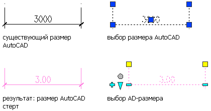 выбран только один размер AutoCAD, новый AD-размер вводится в том же положении, что и размер AutoCAD. Если не стерт исходный размер AutoCAD, AD-размер размещается над ним.
